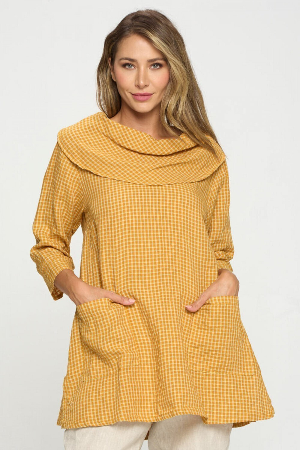65% Linen 35% Polyester Crinkled Checkered 3/4 Sleeve Cowl Neck Tunic Top