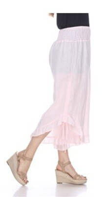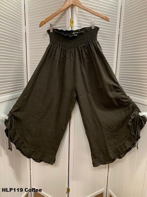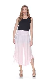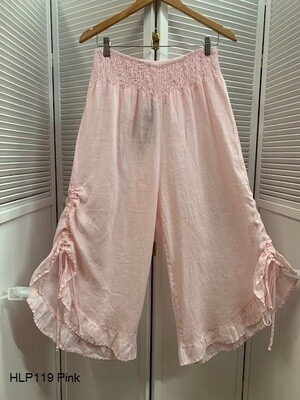 100% light weight linen with multi waist band elastic, gypsy side tie up capri pants