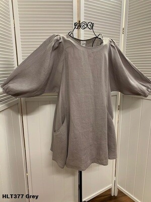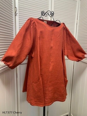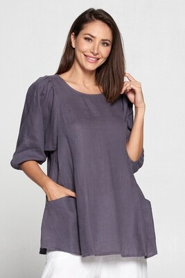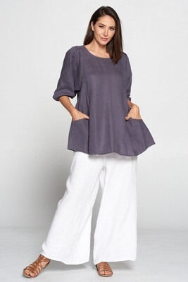 100% Linen, Round Neck 3/4 Elastic Sleeve Pullover Artist Style Tunic with Pockets.