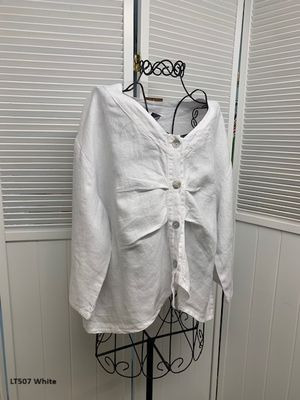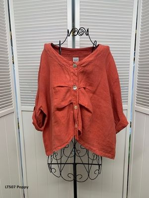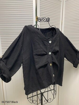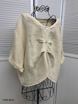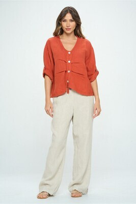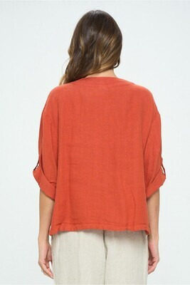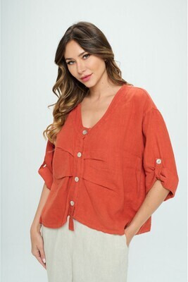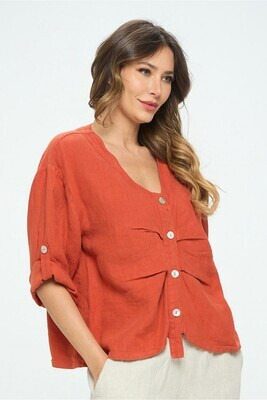 100% Linen, Short Button Up Blouse with Roll Tab Sleeves