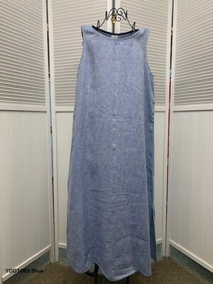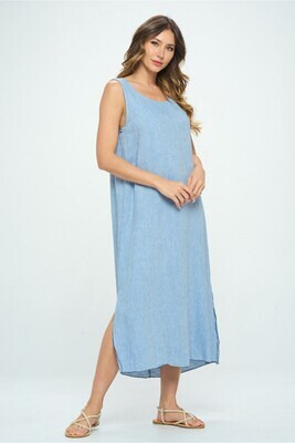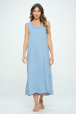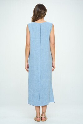100% Linen, Round Neck Sleeveless Long Dress in Yarn Dye Linen